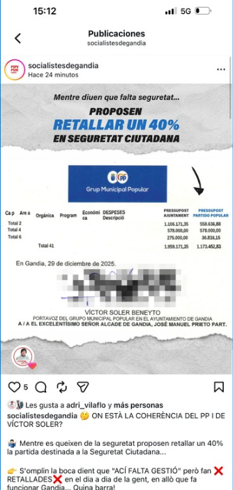 El secretario general de Socialistes Gandia y alcalde de la ciudad, José Manuel Prieto, ha procedido a retirar una publicación difundida en redes sociales tras recibir un burofax del portavoz del Grupo Municipal Popular, Víctor Soler, en el que se advertía de las posibles responsabilidades legales, incluso de carácter penal, derivadas de la difusión de…