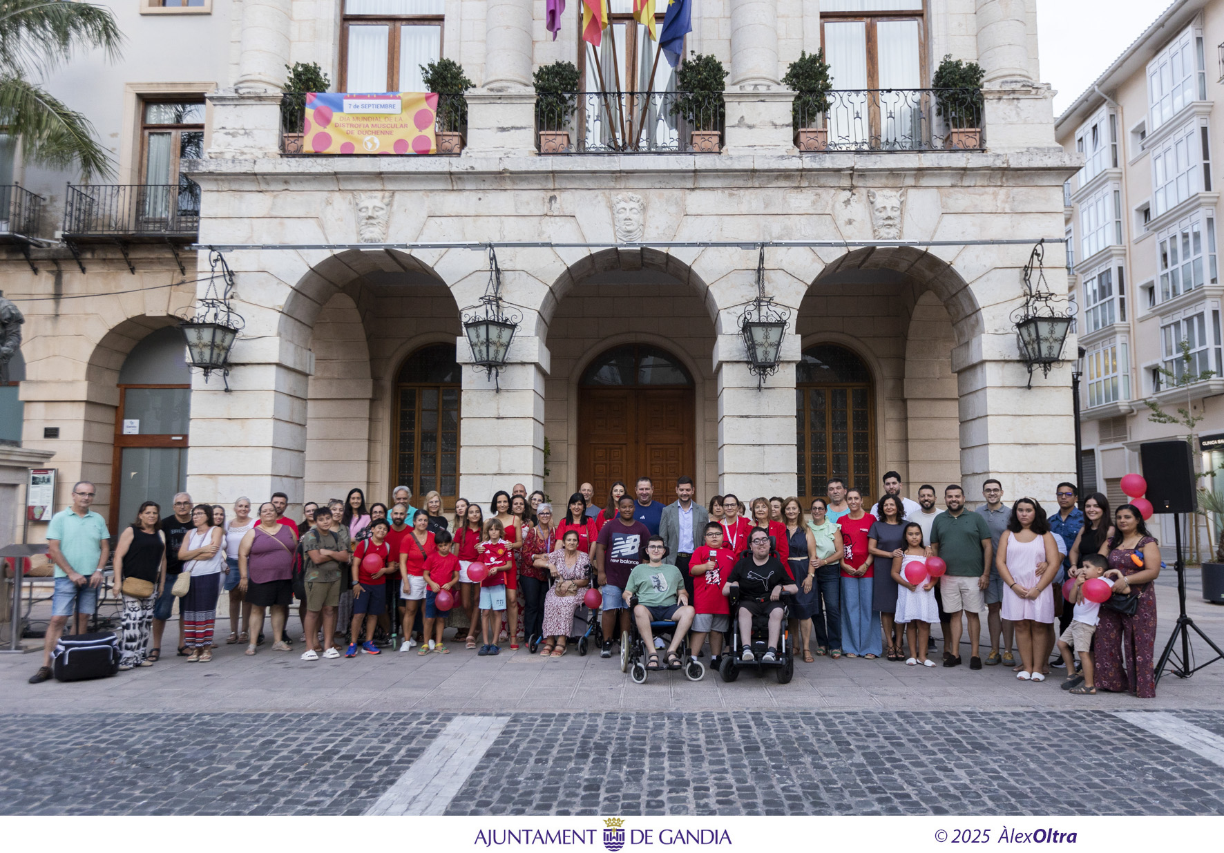 Gandia celebró el pasado viernes el Día Mundial de la Concienciación sobre la Distrofia Muscular de Duchenne y Becker con la lectura de un manifiesto y la iluminación de la fachada del Ayuntamiento.