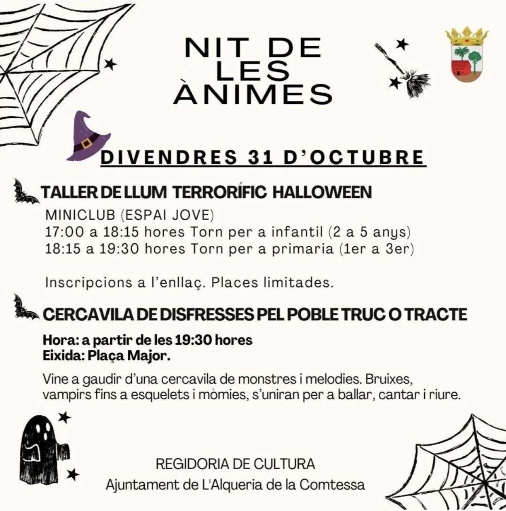 El Ayuntamiento de L’Alqueria de la Comtessa ha anunciado una programación especial para el viernes 31 de octubre con motivo de la celebración de la Noche de las Ánimas. La jornada, pensada principalmente para los más pequeños, transformará las calles del municipio en un escenario de fantasía, color y creatividad.