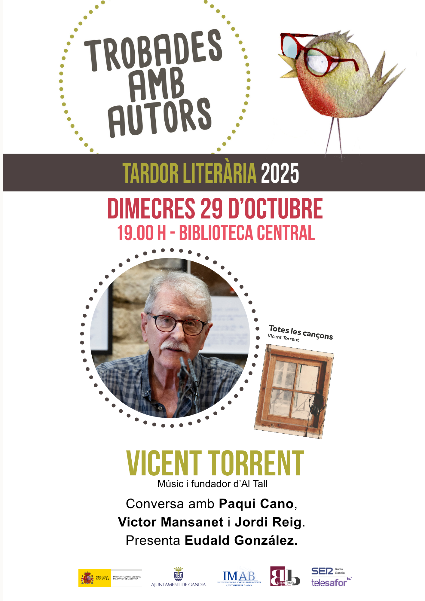 La Biblioteca Central de Gandia acogerá mañana, a las 19:00 horas, una nueva sesión del ciclo Tardor Literària con la presencia de Vicent Torrent, músico y fundador del grupo Al Tall. Durante el acto, Torrent presentará su libro Totes les cançons y mantendrá una conversación abierta con Paqui Cano, Víctor Mansanet y Jordi Reig.