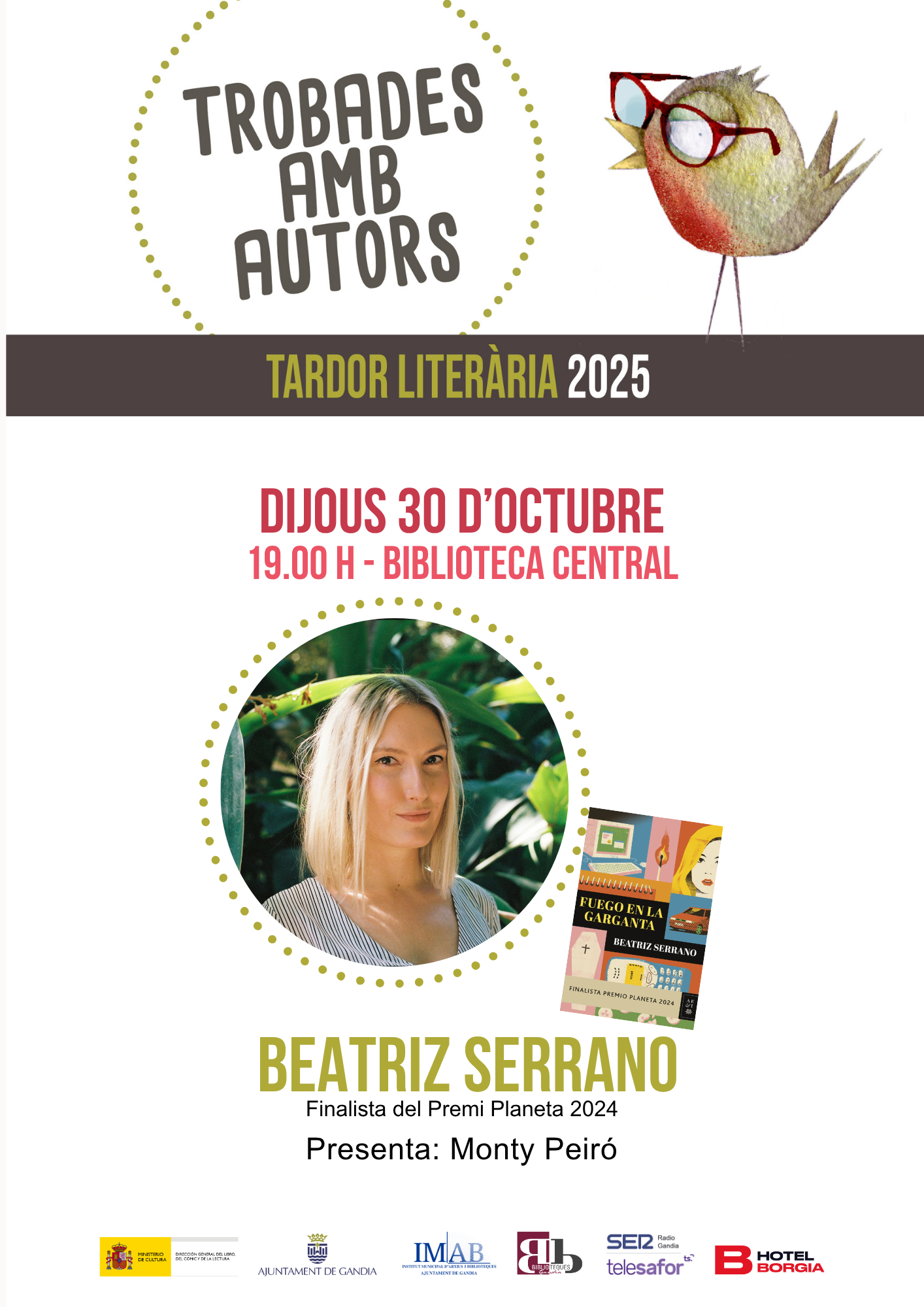 La Biblioteca Central de Gandia acogerá este miércoles, a las 19:00 horas, una nueva cita del ciclo Otoño Literario con la presencia de la escritora Beatriz Serrano, finalista del Premio Planeta 2024 con su novela Fuego en la garganta.