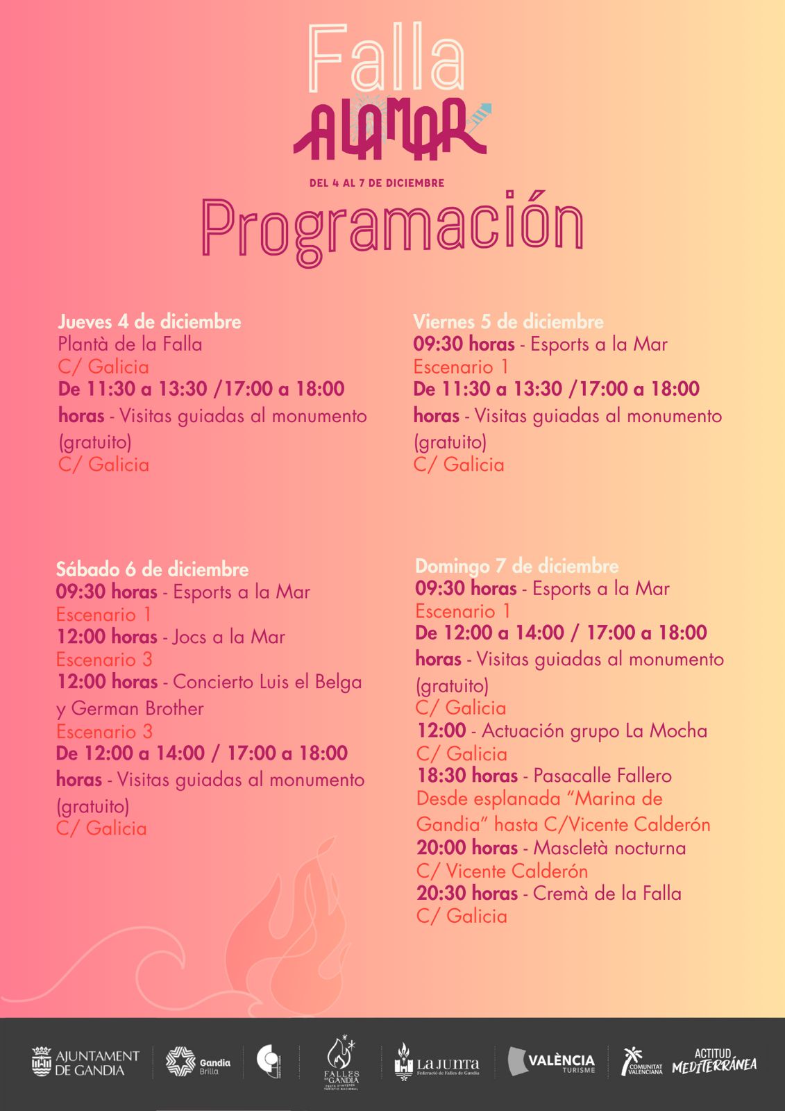El domingo 7 de diciembre combinará nuevamente deporte y tradición, con sesiones de Esports a la Mar y la actuación del grupo La Mocha al mediodía en el carrer Galícia. Ya por la tarde, a las 18:30 horas, se celebrará el Pasacalle Fallero, que partirá desde la explanada de la Marina de Gandia hasta el carrer Vicente Calderón.