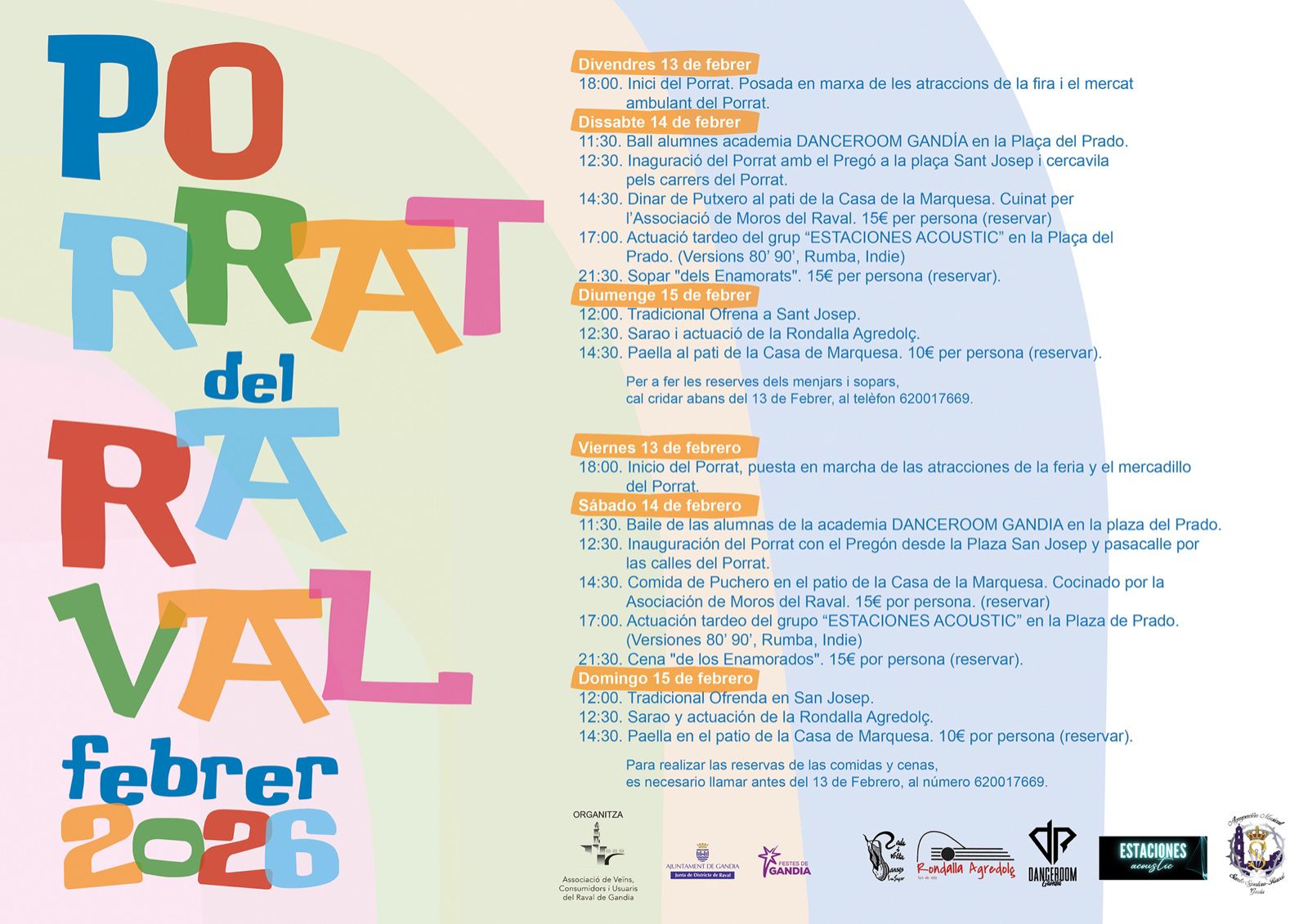 El sábado 14, la programación se iniciará a las 11.30 horas con la actuación del alumnado de la academia Dancer Room Gandía en la plaza del Prado. A las 12.30 horas tendrá lugar el tradicional pregón desde la plaza de San José, seguido de un pasacalle por las calles del Porrat. A las 14.30 horas se celebrará el almuerzo del Putxero en el patio de la Casa de la Marquesa, organizado por la Asociación de Moros del Raval. Por la tarde, a las 17.00 horas, se ha programado un tardeo con el grupo Estaciones Acoustic en la plaza del Prado, y a las 21.30 horas tendrá lugar el tradicional sopar dels enamorats.