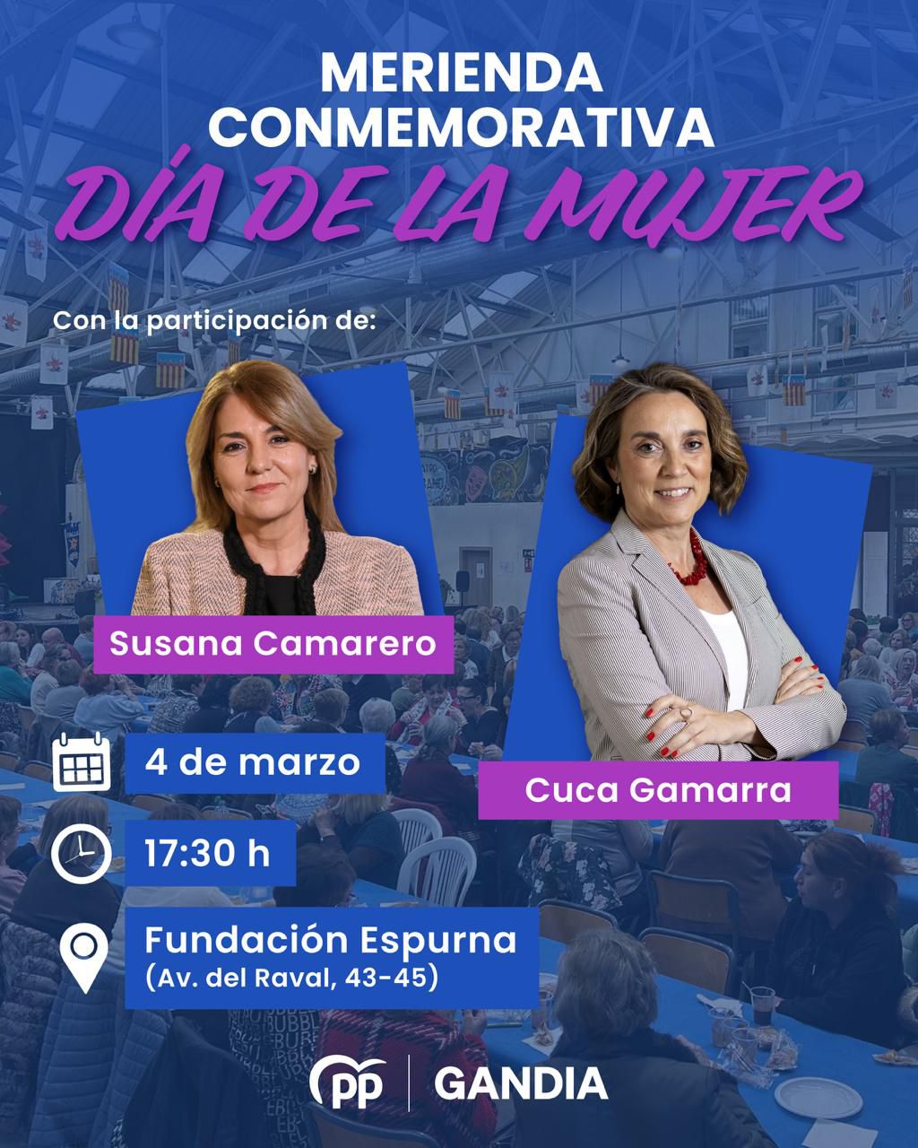 El Partido Popular de Gandia celebrará mañana, miércoles 4 de marzo, a las 17:30 horas, una merienda con motivo del Día Internacional de la Mujer. El acto tendrá lugar en la Fundación Espurna y reunirá a vecinas de la ciudad en una jornada abierta a todas las mujeres de Gandia, concebida como un espacio de convivencia y reconocimiento al papel de la mujer en la sociedad.