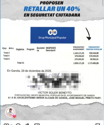 El portavoz del Grupo Municipal Popular de Gandia, Víctor Soler, ha remitido un burofax solicitando la retirada inmediata de una publicación difundida en las redes sociales de Socialistes Gandia en la que, según afirma, aparece una imagen manipulada que incorpora su firma sin su consentimiento. Soler ha advertido de que, en caso de no eliminarse…