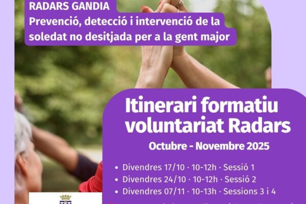El Ayuntamiento de Gandia, a través del Área de Sanidad, Políticas Saludables y Calidad de Vida, continúa avanzando en el desarrollo del proyecto Radars Gandia, una iniciativa comunitaria orientada a la prevención, detección e intervención de la soledad no deseada en las personas mayores del municipio. Con el objetivo de consolidar y ampliar su red…
